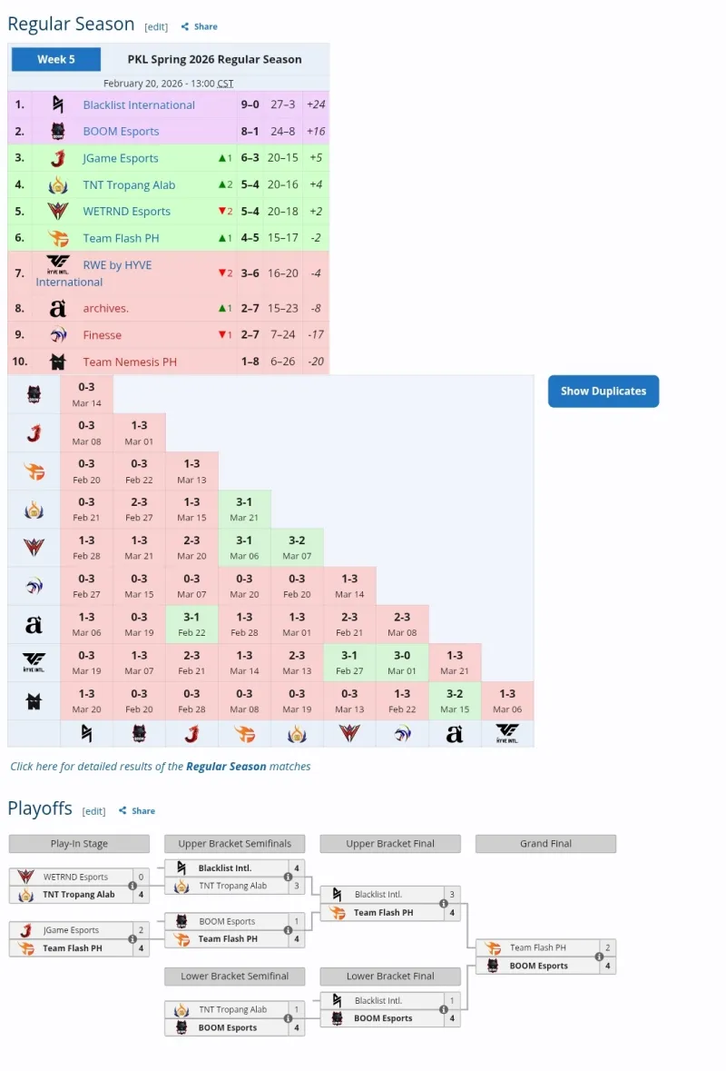 在常规赛阶段,去年包揽联赛冠亚的菲律宾双雄BLCK和BOOM仍旧领跑常规赛分列第一第二,但到了季后赛阶段,常规赛仅排第六勉强进入季后赛的TF开始爆发,一路连斩双雄从胜者组杀进总决赛。但进入败者组的BOOM也找回状态,力克老对手BLCK杀回决赛